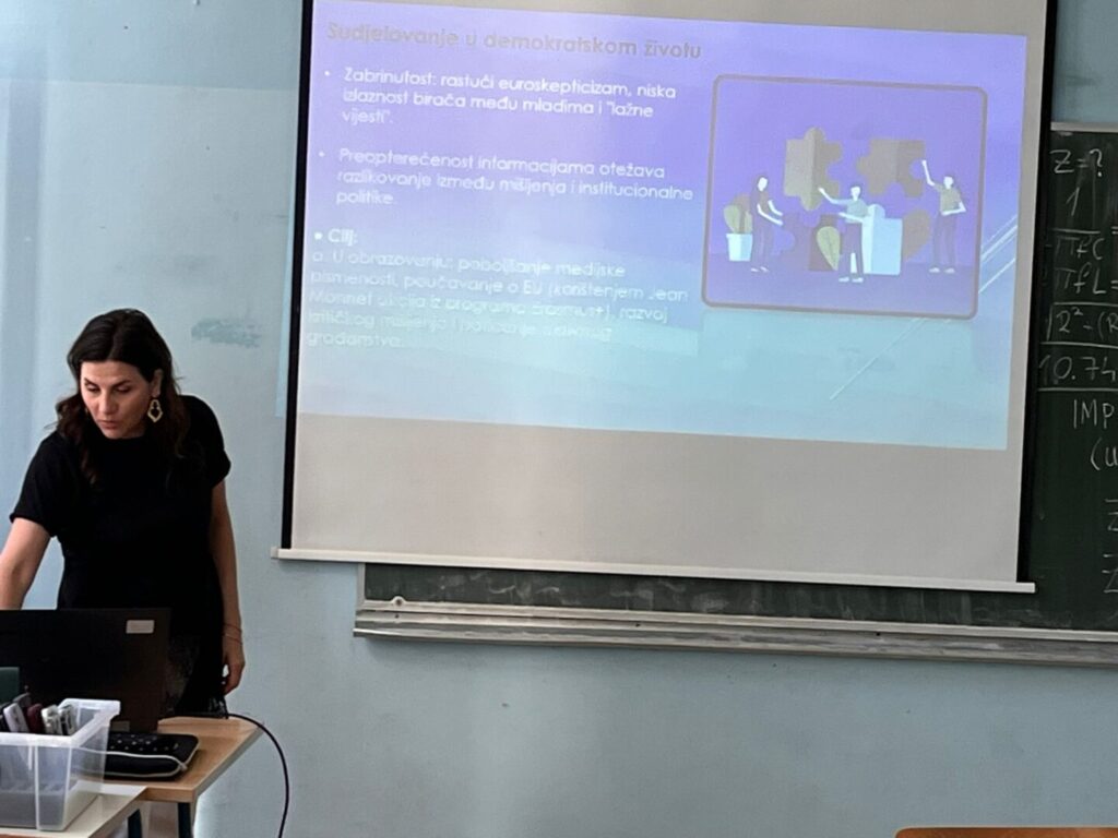 Na samom početku susreta učenici su kroz kratku prezentaciju upoznati s poviješću i osnutkom Europske unije, kao i s temeljnim vrijednostima na kojima ona počiva – demokracijom, jednakosti, solidarnosti, poštivanjem ljudskih prava i slobodom kretanja. Poseban naglasak stavljen je na važnost sudjelovanja mladih u programima poput Erasmus projekata, koji omogućuju razmjenu znanja, iskustava i kultura među državama članicama.